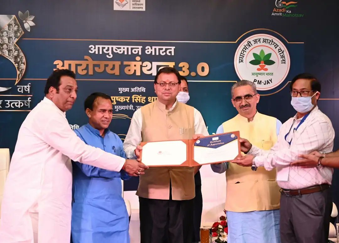 मुख्यमंत्री पुष्कर धामी ने आज ISBT स्थित एक होटल में आयुष्मान भारत योजना के 3 वर्ष पूर्ण होने पर स्वास्थ विभाग द्वारा आयोजित आरोग्य मंथन 3.0 कार्यक्रम में बतौर मुख्य अतिथि प्रतिभाग करते हुए 12 अस्पतालों को सम्मानित किया।