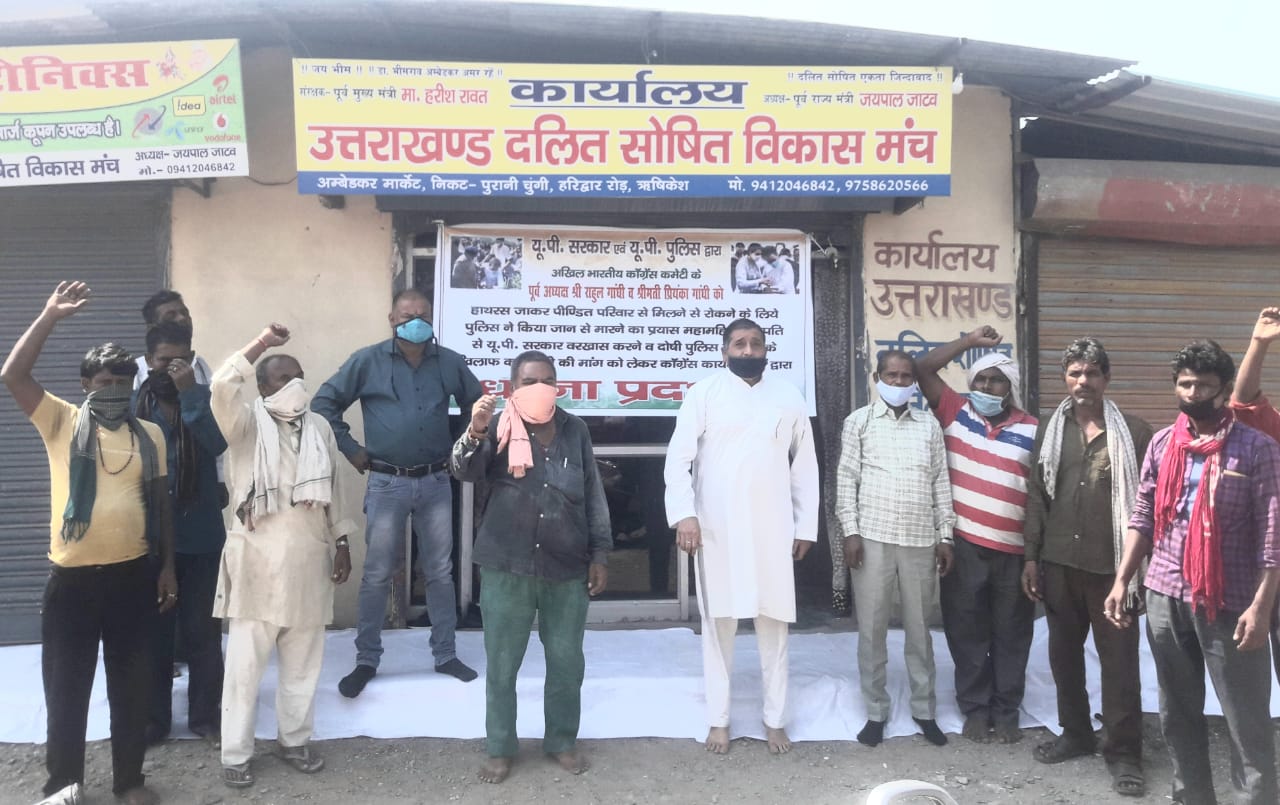 ऋषिकेश 3 अक्टूबर पूर्व घोषित कार्यक्रम के अनुसार पूर्व दर्जा राज्यमंत्री उत्तराखंड कांग्रेस कमेटी के विशेष आमंत्रित सदस्य जयपाल जाटव के नेतृत्व में भारी संख्या में कांग्रेसी कार्यकर्ता सोशल डिस्टेंस के साथ हरिद्वार रोड स्थित कार्यालय पर एकत्रित हुए जहां पर उन्होंने उत्तर प्रदेश की योगी सरकार तथा उत्तर प्रदेश पुलिस के विरुद्ध जोरदार नारेबाजी कर धरना दिया!