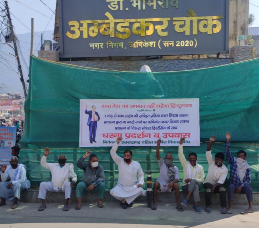ऋषिकेश 21 अक्टूबर 2020, पूर्व घोषित कार्यक्रम के अनुसार नगर निगम ऋषिकेश शासन प्रशासन द्वारा संविधान के निर्माता डॉक्टर भीमराव अंबेडकर की खंडित प्रतिमा 2 माह बाद भी ना बदले जाने पर पूर्व राज्य मंत्री उत्तराखंड दलित शोषित विकास मंच के प्रदेश अध्यक्ष जयपाल जाटव के नेतृत्व में रेलवे रोड डॉक्टर भीमराव अंबेडकर चौक पर प्रतिमा के सामने नगर निगम ऋषिकेश तथा शासन प्रशासन के विरुद्ध प्रदर्शन कर धरना देकर उपवास रखा!