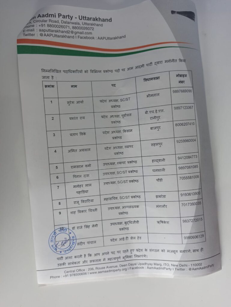 आम आदमी पार्टी के जिला मीडिया प्रभारी डॉ राजे सिंह नेगी की योग्यता एवं उनकी सक्रियता को देखते हुए पार्टी ने उनका प्रमोशन करते हुए उन्हें बुद्धिजीवी प्रकोष्ठ का प्रदेश उपाध्यक्ष एवं पार्टी के पूर्व प्रवक्ता रहे विजय सिंह पंवार को प्रदेश कार्यकारिणी सदस्य मनोनीत किया है। ‘आप’ की प्रांंतीय कार्यकारिणी में अहम जिम्मेदारी सौंपे जाने पर पार्टी कार्यकर्ताओं ने हर्ष जताया है।
