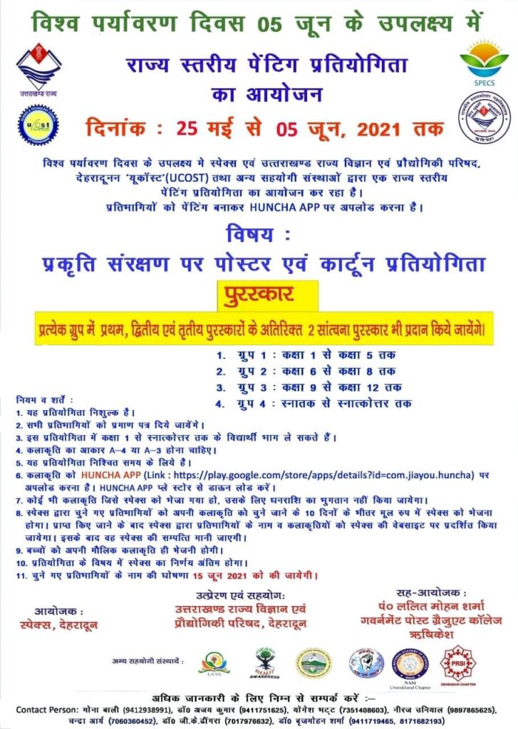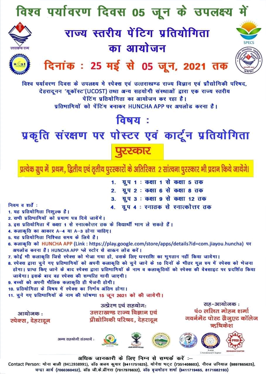 स्पेक्स संस्था, देहरादून द्वारा राज्य विज्ञान एवं प्रौद्योगिकी परिषद देहरादून (यूकॉस्ट) के सहयोग एवं पंडित ललित मोहन शर्मा राजकीय स्नातकोत्तर महाविद्यालय, ऋषिकेश (श्रीदेव सुमन उत्तराखंड विश्वविद्यालय परिसर) एवं पब्लिक रिलेशन सोसाइटी ऑफ इंडिया के सह-संयोजन में पर्यावरण दिवस 5 जून के उपलक्ष्य में एक राज्यस्तरीय ऑनलाइन पोस्टर व कार्टून प्रतियोगिता का आयोजन किया जा रहा है ।