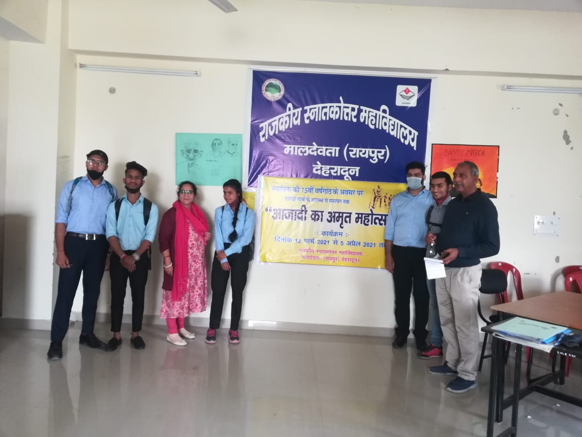 रायपुर, देहरादून (संजय राजपूत)। आजादी के अमृत महोत्सव कार्यक्रम के तहत राजकीय स्नातकोत्तर महाविद्यालय मालदेवता रायपुर देहरादून में विभिन्न प्रतियोगिताएं आयोजित की गई। छात्र छात्राओं द्वारा प्रतियोगिता मैं उत्साह पूर्वक प्रतिभाग किया। प्राचार्य महाविद्यालय डॉ सतपाल साहनी जी के नेतृत्व में “आजादी का अमृत महोत्सव” कार्यक्रम के अन्तर्गत दिनाँक 12 मार्च 2021 से प्रतिदिन महाविद्यालय में कार्यक्रम आयोजित किए जा रहे हैं। गत दिवस स्वच्छता अभियान कार्यक्रम के द्वारा महाविद्यालय परिसर की सफाई के साथ गांधी जी के आदर्शों को को आत्मसात किया। महाविद्यालय में आयोजीत विभिन्न प्रतियोगिताएं एवं विजयी प्रतिभागियों का विवरण निम्न है. निबंध प्रतियोगिता, प्रथम स्थान – विनीता,बी. एस. सी. पंचम सत्र, द्वितीय स्थान, प्रिया, बी. एस. सी. प्रथम वर्ष, तृतीय स्थान अनुराधा एम. ए. तृतीय सत्र, शुभम ने संयुक्त रूप से प्राप्त किया। स्लोगन प्रतियोगिता में राहुल, बी. ए. द्वितीय वर्ष ने प्रथम स्थान, महिमा, बी. ए. प्रथम वर्ष ने द्वितीय स्थान, कीर्ति बिष्ट बी. ए. प्रथम वर्ष ने तृतीय स्थान प्राप्त किया। ग्रीटिंग कार्ड प्रतियोगिता में माधवी बी. ए. द्वितीय वर्ष ने प्रथम स्थान, हिमानी बी. एस. सी. द्वितीय वर्ष ने द्वितीय स्थान, बबिता यादव बी. ए. प्रथम वर्ष ने तृतीय स्थान प्राप्त किया।भाषण प्रतियोगिता में, जिसका विषय “महात्मा गांधी का व्यक्तित्व एवम् कृतित्व “था, शुभम थपलियाल बी. ए. पंचम सत्र, प्रथम स्थान, युवराज बी. एस. सी. द्वितीय स्थान, बबिता यादव बी. ए. प्रथम वर्ष तृतीय स्थान पर रही। प्राचार्य महाविद्यालय प्रोफेसर सतपाल साहनी ने कहा कि इस प्रकार की प्रतियोगिताएं छात्र छात्राओं का बहुमुखी विकास करती है।