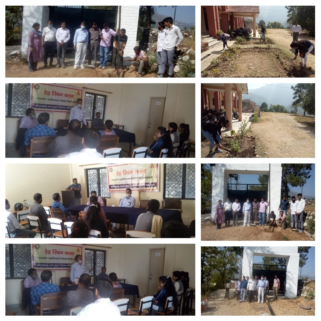 पौखाल, राजकीय महाविद्यालय में “रेड रिबन क्लब” के अंतर्गत प्राचार्य प्रो. ए. एन. सिंह जी की अध्यक्षता में, संयोजक डॉ. संदीप कुमार के निर्देशन में सामाजिक दूरी का पालन करते हुए ” हम जागरूक तो समाज जागरूक” नामक विषय पर एक गोष्ठी का आयोजन किया गया। गोष्ठी में प्राचार्य प्रो. ए. एन. सिंह जी कहा कि छात्र/ छात्रायें इस देश का भविष्य है ओर हमे इस भविष्य को बचाना है इसके लिए हमे जागरूक होना ही पड़ेगा। संस्था में रेड रिबन क्लब का बनना ही इसी उद्देश्य को पूरा करेगा। प्राचार्य जी ने अवगत कराया कि हमारी संस्कृति में 4 प्रकार के आश्रमों की बात कही गई है, छात्र/ छात्रायें अभी ब्रह्मचर्य आश्रम में है और सभी को इसकी मर्यादा में रहना है। सभी को एक दूसरे का सम्मान करना है। जैसे जैसे इन आश्रमों को व्यक्ति पार करता हुआ चला जाता है वैसे ही उनके कर्तव्य भी समाज मे बदलते चले जाते हैं। अतः हम सभी का जागरूक होना बहुत जरूरी है। कार्यक्रम संयोजक डॉ संदीप कुमार ने रेड रिबन क्लब की स्थापना, इसके कार्य और AIDS के विषय पर चर्चा की। डॉ मीनाक्षी वर्मा ने कहा कि छात्राओं को समाज की गतिविधियों पर भी ध्यान देना है स्वयं को नकारात्मक विचारों से भी दूर रहना है तो वही डॉ संजीव प्रसाद जी ने सभी को वैदिक संस्कृति को अपनाने पर जोर दिया। गोष्ठी में के बाद महाविद्यालय में प्राध्यापकों, कर्मचारियों और छात्र/ छात्रों द्वारा श्रमदान भी किया गया। गोष्ठी में प्राचार्य प्रो. ए. एन., डॉ संदीप कुमार, डॉ संजीव भट्ट, डॉ. बालक राम भद्री, डॉ. मीनाक्षी वर्मा, डॉ दिनेश सिंह नेगी, डॉ दिलीप सिंह, श्री राजेन्द्र सिंह बिष्ट, श्री राजेन्द्र राणा, श्री मनोज राणा, श्री अनिल सिंह, श्री गंभीर, श्री रोशन लाल, श्री उत्तम रावत और नीलम, मनीषा, शिवानी, अजय चंद, मोहित सिंह, नवीन, कोमल, स्मिता छात्र/ छात्रायें उपस्थित रहे।