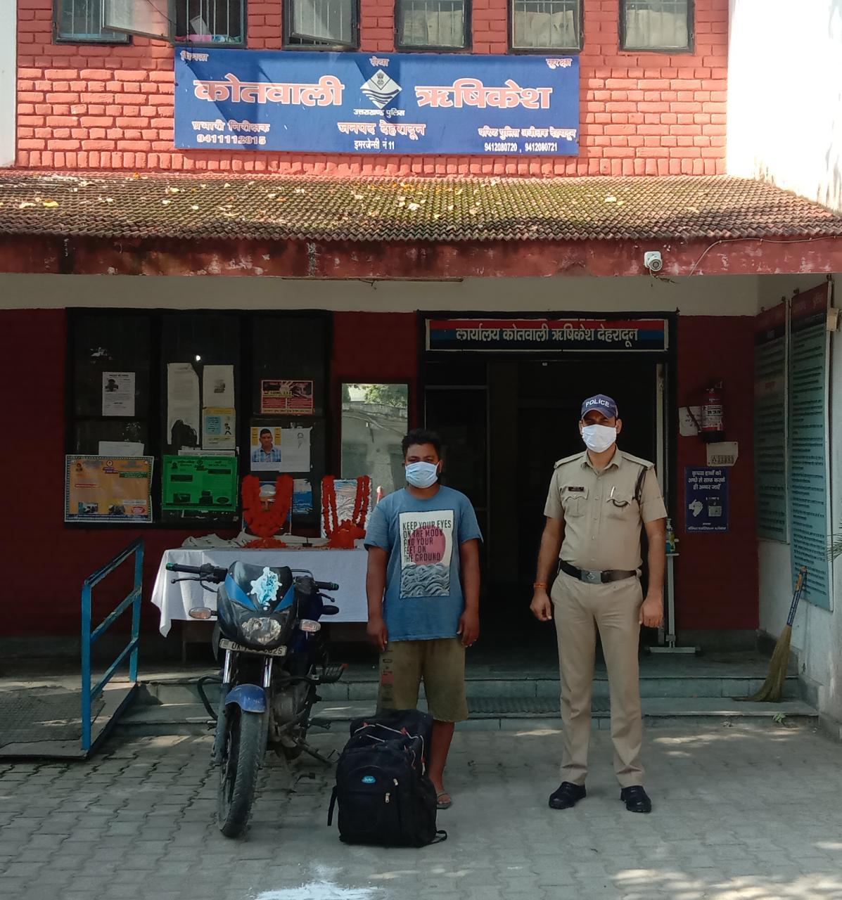 ऋषिकेश दिनांक 2 अक्टूबर 2020 अवैध नशा तस्करी के विरुद्ध अभियान में न्यू रेलवे पुल नटराज चौक से आगे जंगल के पास चेकिंग के दौरान विनोद कुमार पुत्र प्रेम किशोर निवासी शांति नगर रानीपोखरी थाना रानीपोखरी मोटरसाइकिल नंबर यूके 1408 25 में 7 60 पव्वे देसी शराब के साथ गिरफ्तार किया गया!